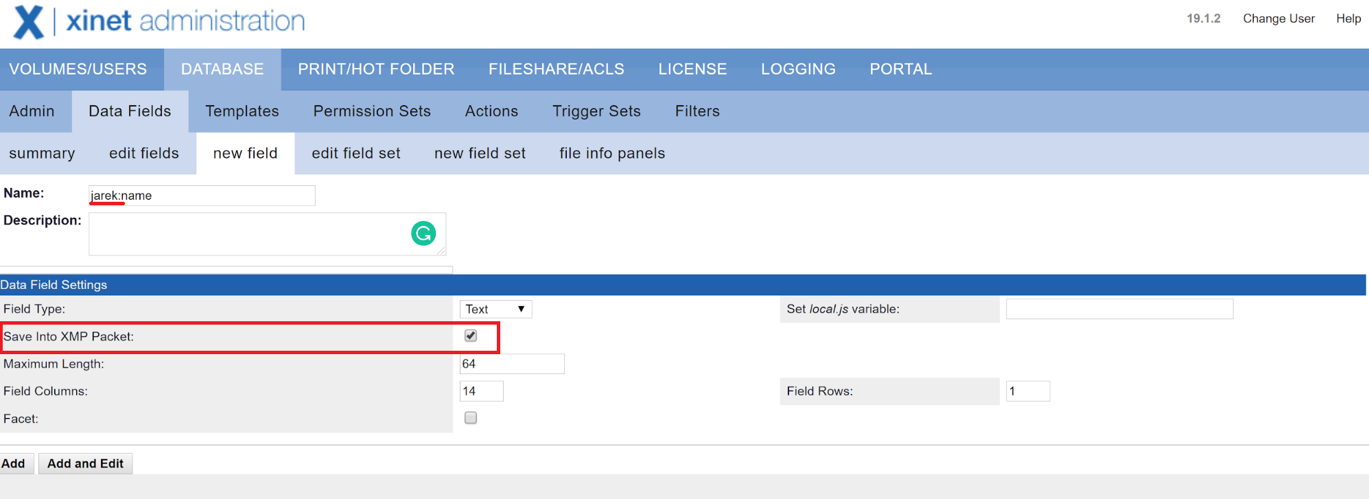 To test if the new XMP namespace is functioning or not, create a new data field in the Xinet database with the custom namespace by following the below steps: