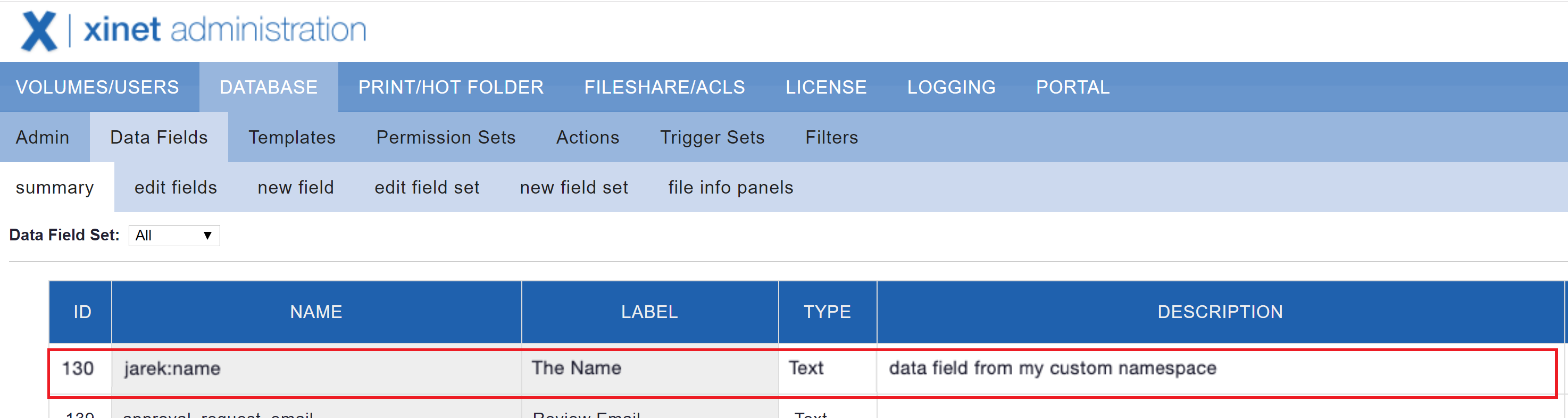 - Verify that the new custom namespace data field appears on the DATABASE > Data Fields > summary tab.